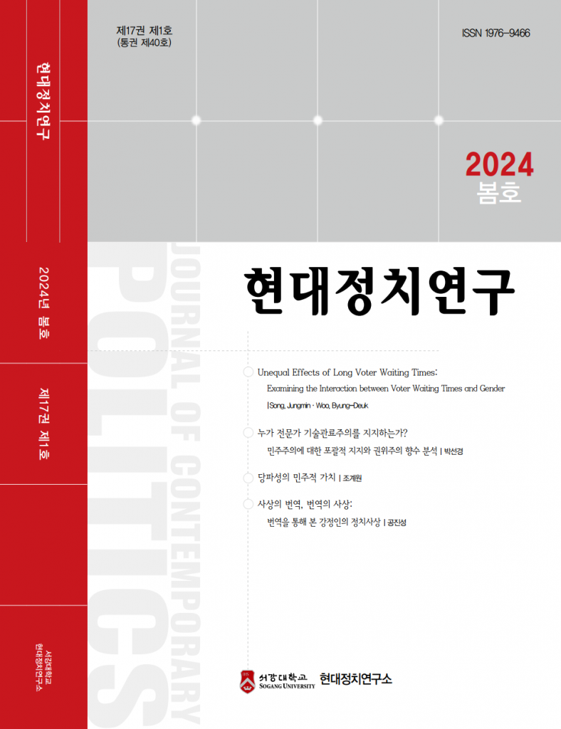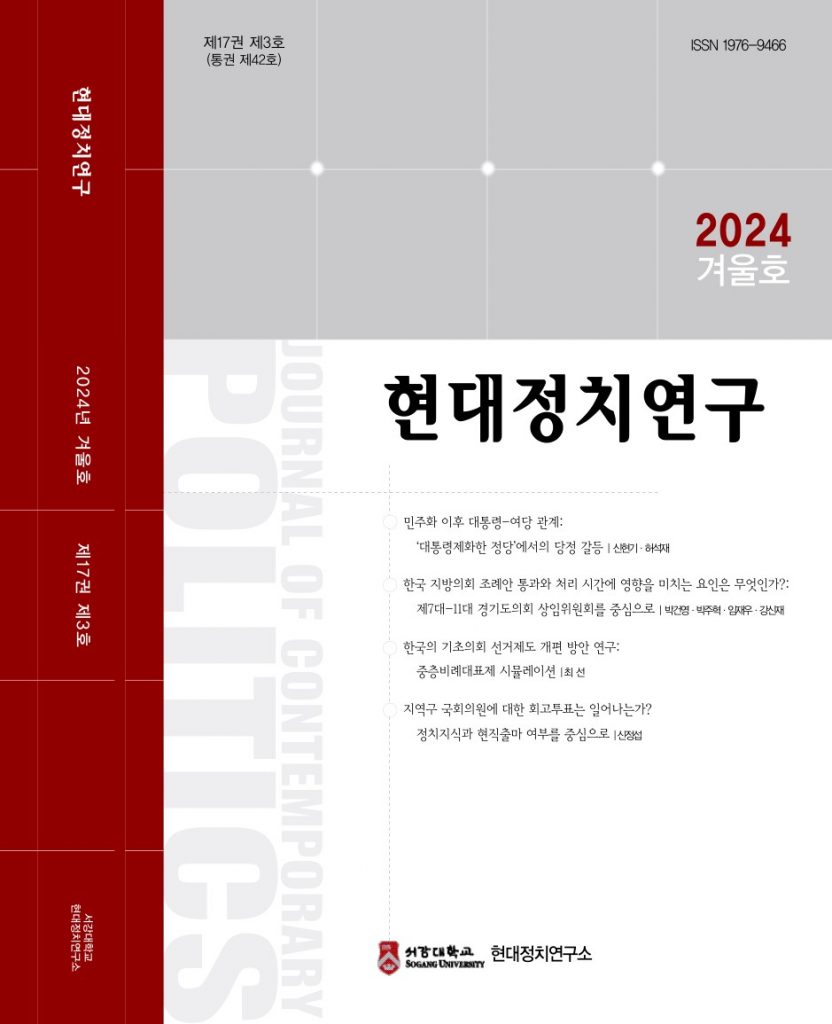 장훈 · 한은수. 2019. “대의제 공고화론과 시민 민주주의: 한국 민주주의 이론과 현실의 불균형.” 『현대정치연구』 제12권 제1호, 39-70.