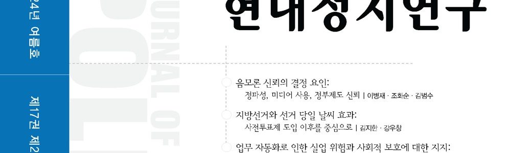 현대정치연구 17권 2호 2024년 9월 1일 통본-현대정치연구-17권-2호다운로드 1.-이병재조화순김범수_2024_음모론-신뢰의-결정-요인_6-50다운로드 2.-김지한강우창_2024_지방선거와-선거-당일-날씨-효과_51-77-1다운로드 3.-김태심_2024_업무-자동화로-인한-실업-위험과-사회적-보호에-대한-지지_79-117-1다운로드 4.-이서영박영득_2024_정치이념과-친환경-태도_119-145-1다운로드 5.-고민희이혜영_2024_누가-여성할당제를-반대하는가_148-194-1다운로드 6.-이상원_2024_The-Troubled-Relationship-of-Friendship-Fraternity-and-Democracy_196-227-1다운로드 7.-김민혁조대근_2024_전후-자유주의의-반反극단주의적-전통에-관한-연구_229-261-1다운로드 < 이전 페이지로
