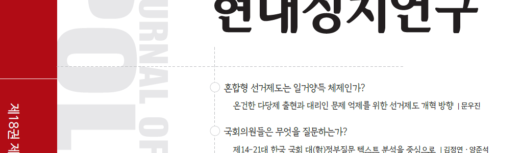 현대정치연구 18권 1호 2025년 5월 22일 통본 현대정치연구 제18권 1호다운로드 1. 문우진_ 혼합형 선거제도는 일거양득 체제인가? 다운로드 2. 김정연&양준석_ 국회의원들은 무엇을 질문하는가? 다운로드 3. 김민혁_레이몽 아롱의 다원적 자유 개념에 관한 시론적 연구다운로드 4. 이병재&서재권_Determinants of the Quality of Life in Two South Korean Cities다운로드 < 이전 페이지로