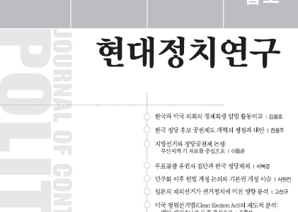 현대정치연구 3권1호 2010년 7월 13일 미국 청렴선거법(Clean Election Act)의 제도적 분석 일본의 재외선거가 선거정치에 미친 영향 분석 민주화 이후 헌법 개정 논의와 기본권 개정 이슈 투표불참 유권자 집단과 한국 정당체제 지방선거와 정당공천제 논쟁 한국 정당 후보 공천제도 개혁의 쟁점과 대안 한국과 미국 의회의 경제회생 입법 활동비교 < 이전 페이지로